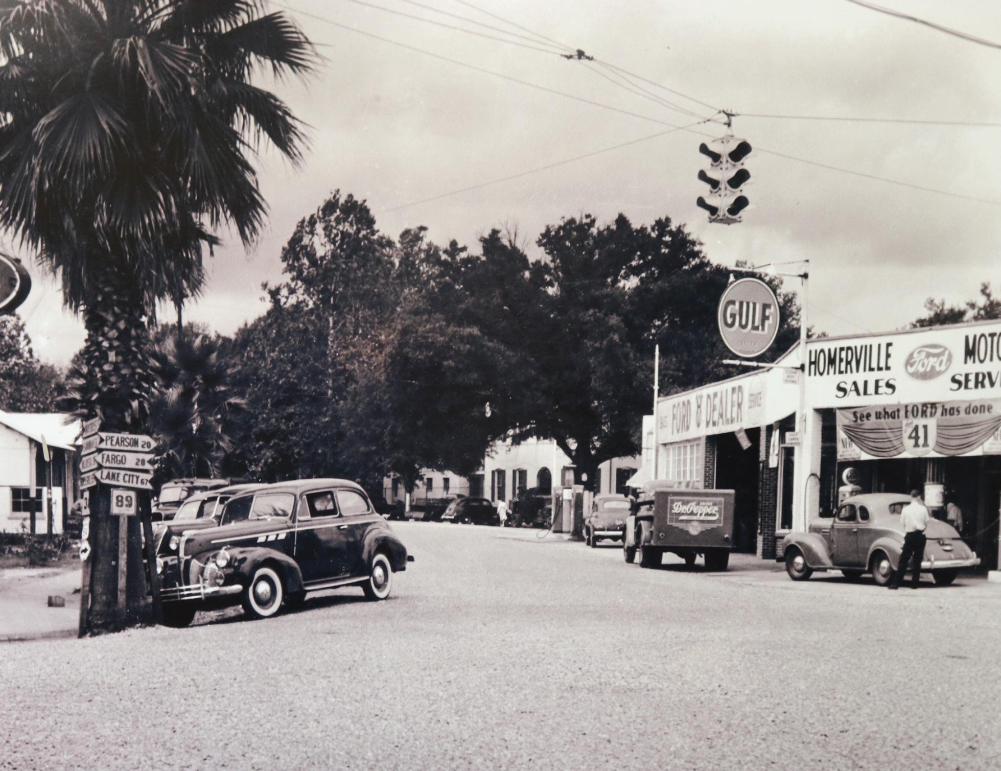 Over time, the railroad brought commerce and prosperity to the community, with new residential neighborhoods and commercial buildings radiating from the depot. Historical images of downtown Homerville show the area’s wide streets divided by lush medians and shaded by impressive street trees. Outside of downtown, a thriving timber industry developed