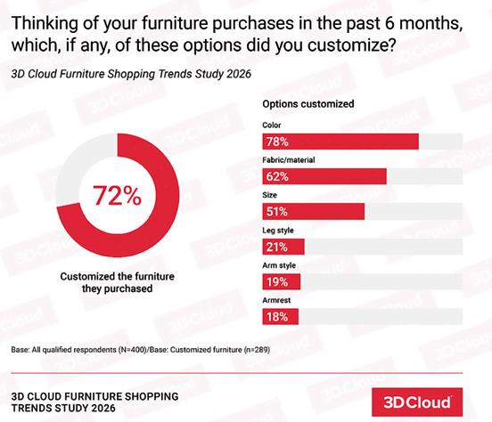 The 3D Cloud Furniture Shopping Trends Study, 2026, makes the shift clear. 72% of shoppers say they are more likely to purchase when they can customise or configure furniture online, and 67% now expect configuration options in modular categories such as sectional sofas.