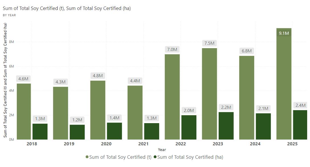 In 2025*, we reached 10.3 million tonnes of certified soy, representing an increase of over 42% compared to 2024.