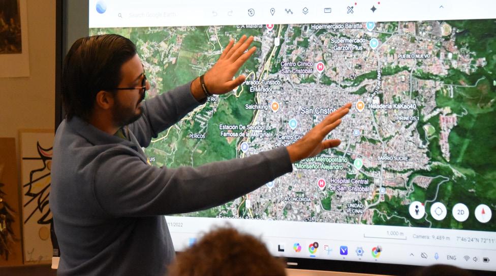 PERTINENT PRESENTATION. Guest speaker Carlos Piñero uses Google Earth to talk about his life in Venezuela. His lesson gave context to the U.S. strikes on Venezuelan military bases and the indictment and abduction of Venezuelan President Nicolás Maduro on Jan. 3. “I was hoping for students to be able to ask questions to somebody who is currently living under that repressive system,” Christine Piñero said.