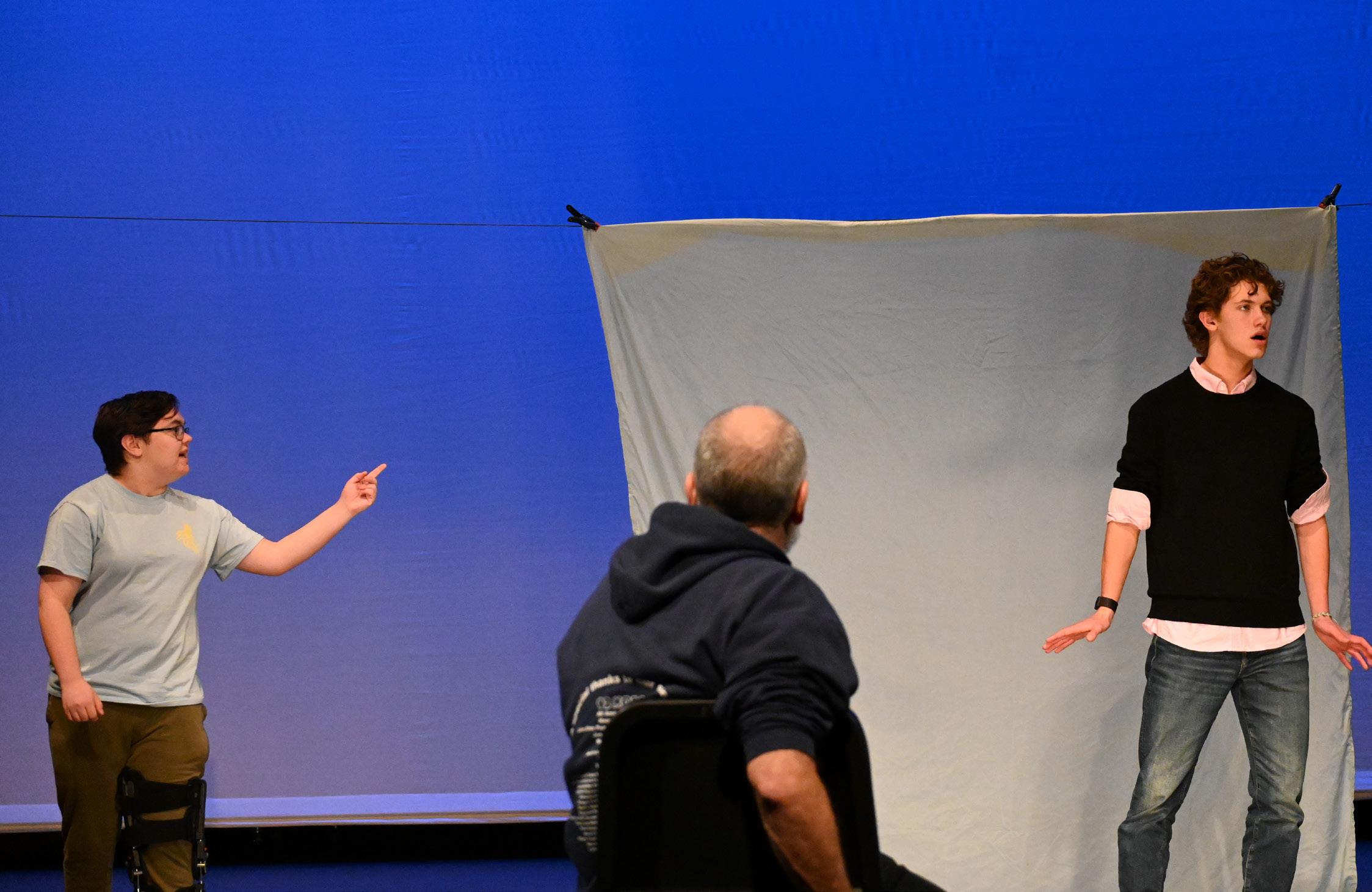 The cast quickly began playing the moments of the script they had laid out the afternoon before. Two students walked through their scene to start while the others watched and waited for their cues offstage. Ferguson sat in a chair onstage and directed the piece that was being developed in front of him.