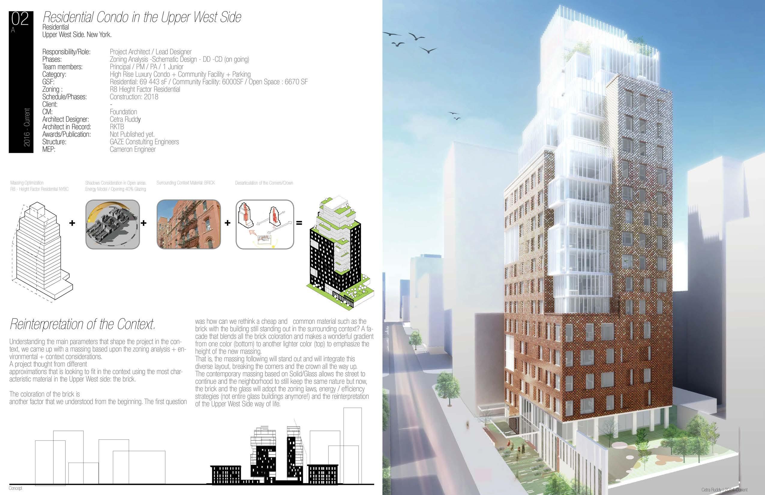 Zoning analysis studies, massing strategy based on zoning envelope. Residentail prelimianry layouts. Consultant coordinations, developer-broker workshop and presentations. In house rendering, BIM modeling and
