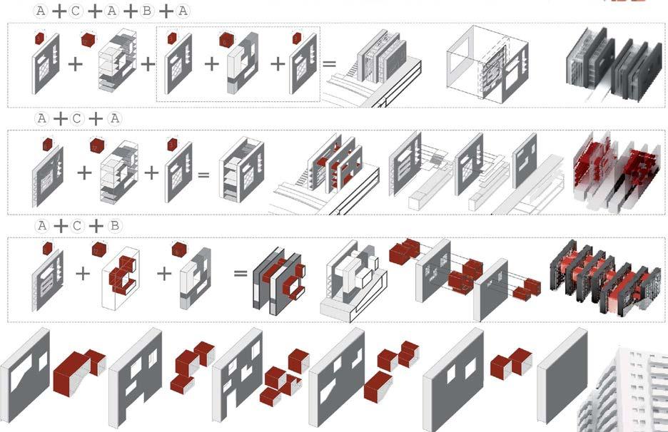 Explicacion tridimensional de las diferentes configuracions A, B o C. Se llega a la conclusion de que la secuencia A+C+B propondria un espacio eficaz para un programa de usos mixtos en un entorno residencial. Para una mejor compresion de los espacios acuiferos sin recurri al color , se utiliza una sucesion.