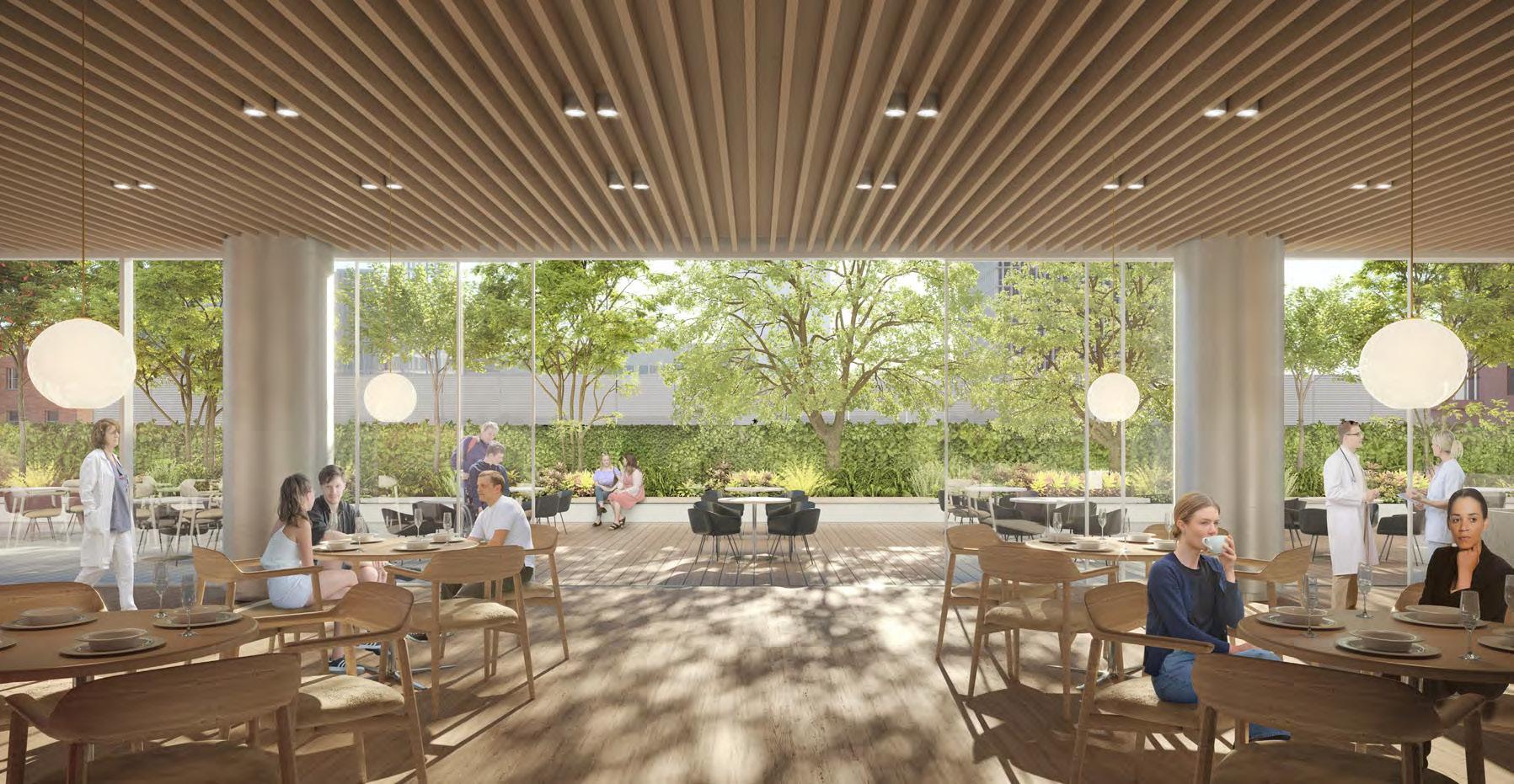 An expansive green roof provides outdoor patient amenities as well as effective thermal insulation for the podium