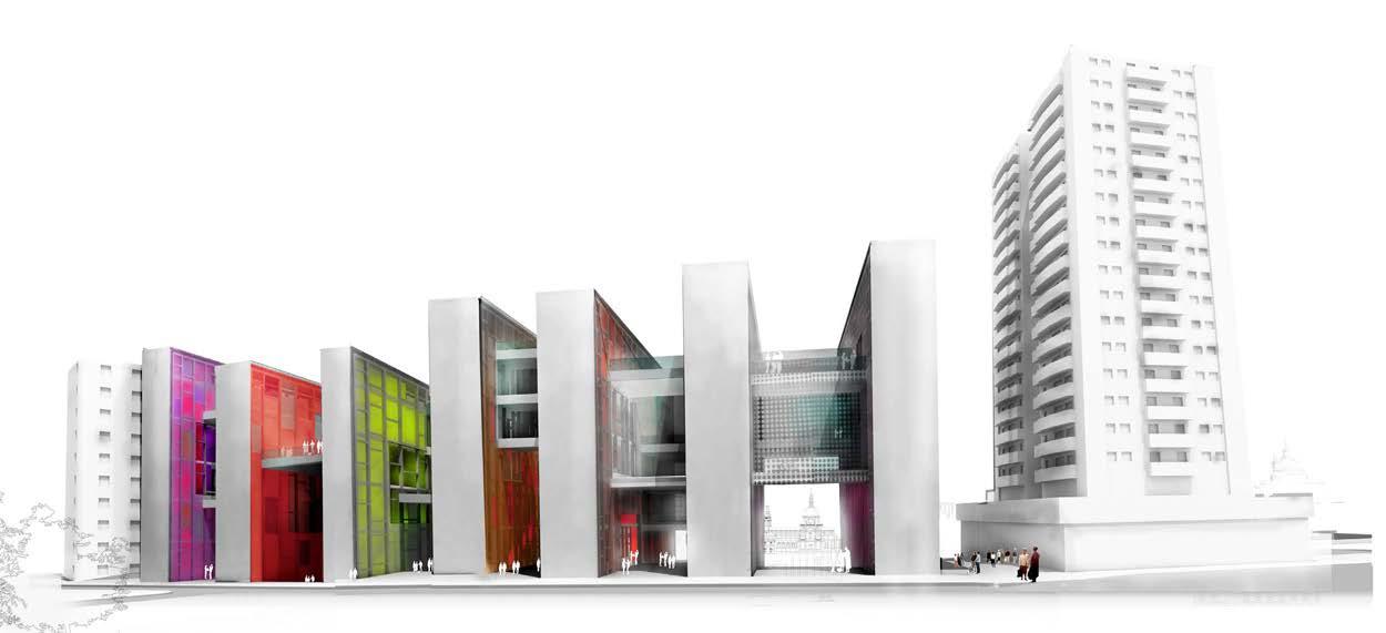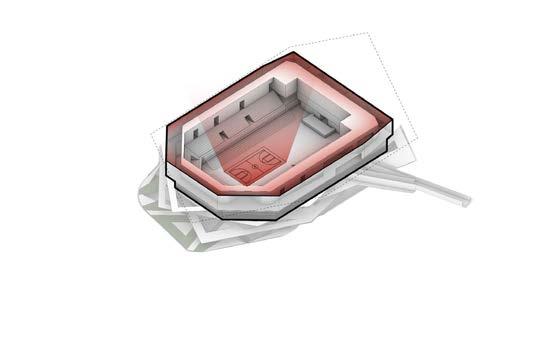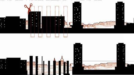 The existing site consisted of buildings that created a long visual and physical barrier between old Madrid and its new linear park. The project therefore tries to connect these two spaces, by cutting the barrier, with the wall as an architectonic concept.