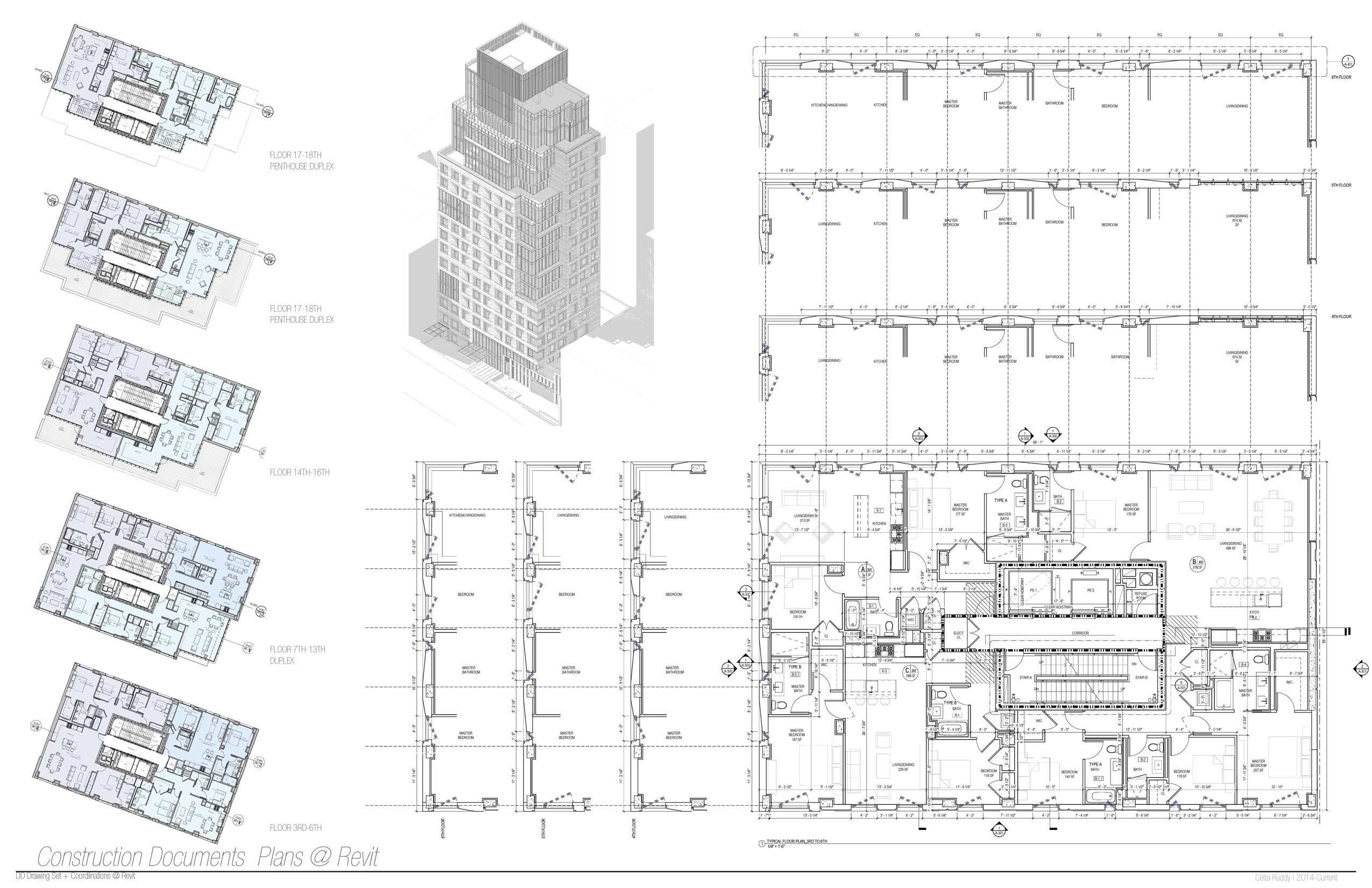 DN DN UP UP 17' 14'-7 1/2" LIVING/DINING 10' 12'-8 1/2" MEDIA ROOM BEDROOM W/D W/D 11' 1/2" BEDROOM 1/2" 10'-4 1/2" BEDROOM 11'-5" MASTER BEDROOM 23' 0" 13'-0" LIVING/DINING MASTER BEDROOM BEDROOM BEDROOM UP 14'-7 1/2" LIVING/D 14'-7 1/2" LIVING/DINI 11' 10" 4' 0" 5' 5" 7' 2" 1' 10" 36' 10" 1' 6"2' 10"4' 0" 5' 8" - 10" 5' 0" 8' 2" 6" 10' 7TH FLOOR TERRACE BELOW 10' 2" 9' 8" 9' 8" 10' STAIR STAIR POWDER BATH CL 1571 SF A 3BR 1481 SF B 3BR (1082 SF) C 4BR 2166 BATH BATH BATH MASTER WIC CL WIC KITCHEN CL PE PE REFUSE ROOM CORRIDOR ELECT. 14' 8" 4' 0" 11'7" 10TH FLOOR 10TH FLOOR 12TH FLOOR EQ EQ EQ EQ EQ 1/4" 1'-0" TYPICAL FLOOR PLAN_8TH, 10TH, 12TH Interior unit layouts..... Revit coordination... In house rendering.