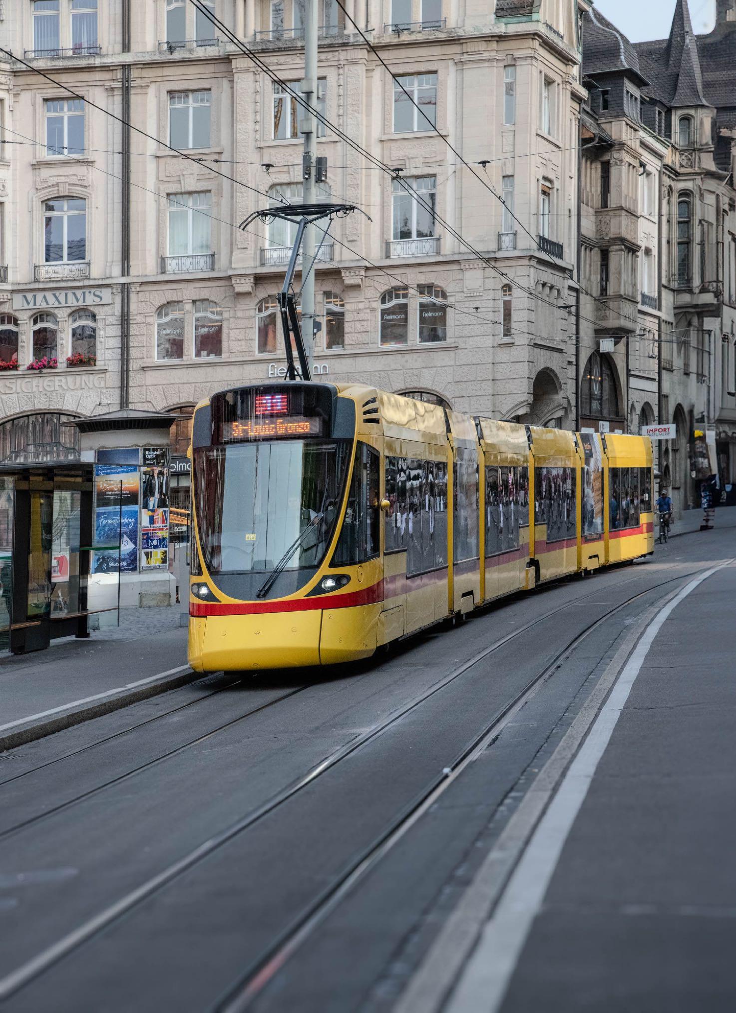 Die Straßenbahnen in Basel (s Drämli) sind grün und verkehren innerhalb der Stadt Basel. Die Tramlinien 3 und 8, sowie die Buslinien 38 und 55 fahren auch über die Landesgrenzen. Alle