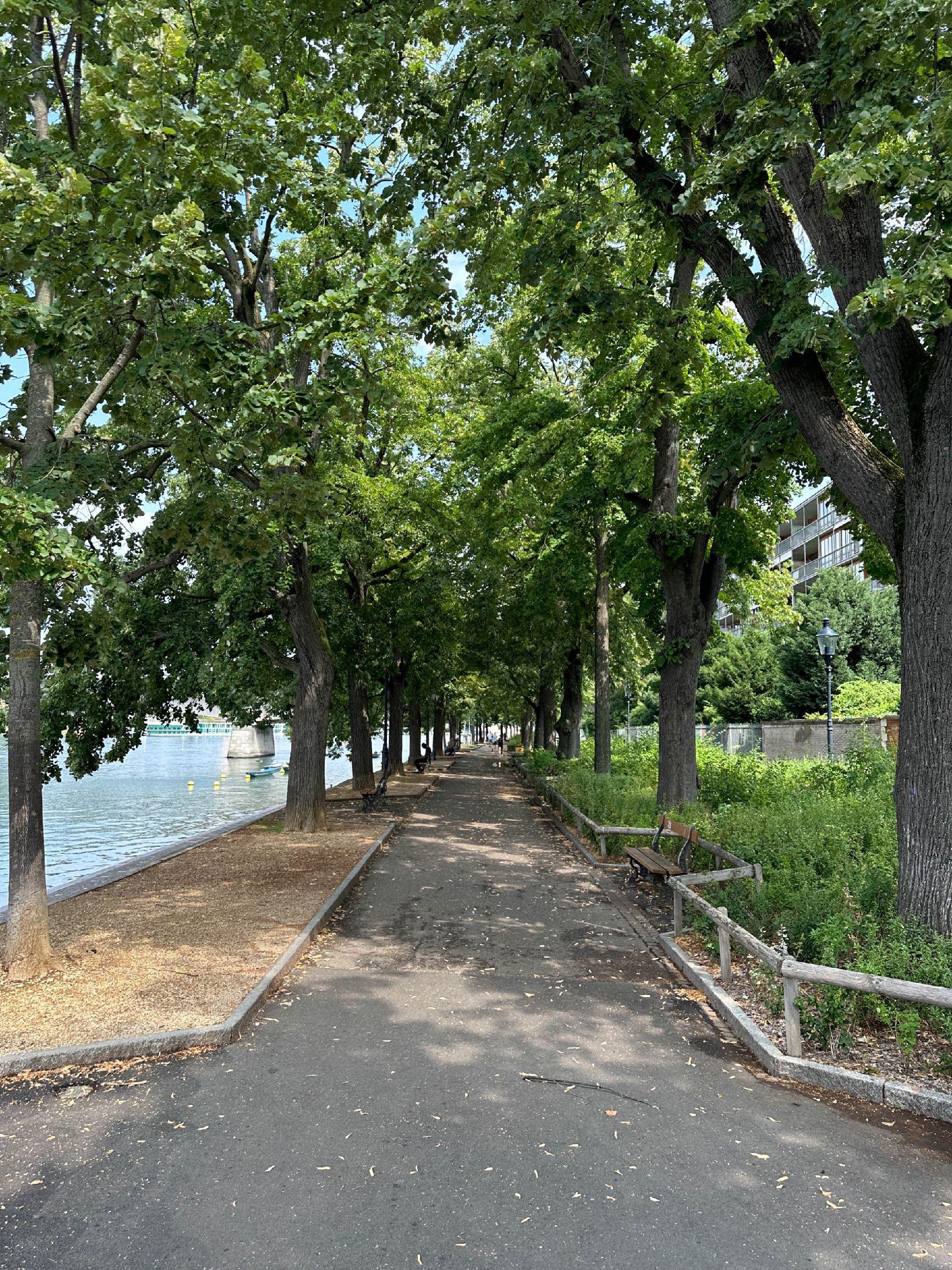 Um die gegenüberliegende Seite des Rheins zu erreichen, kann man eine der vier Fähren-Anlegestellen nutzen. Im Sommer bieten große Bäume angenehmen Schatten und reihen sich um Grünflächen, Kiesstrände und Rheinbäder.