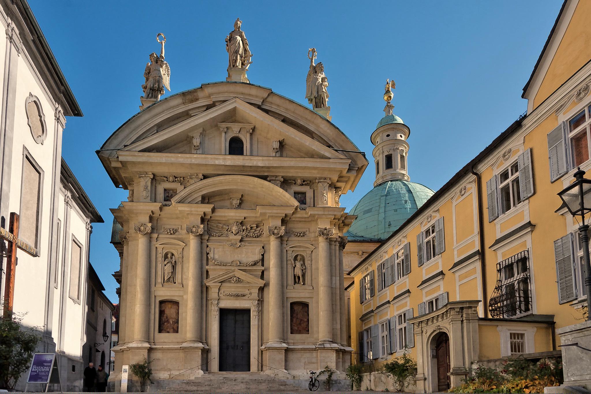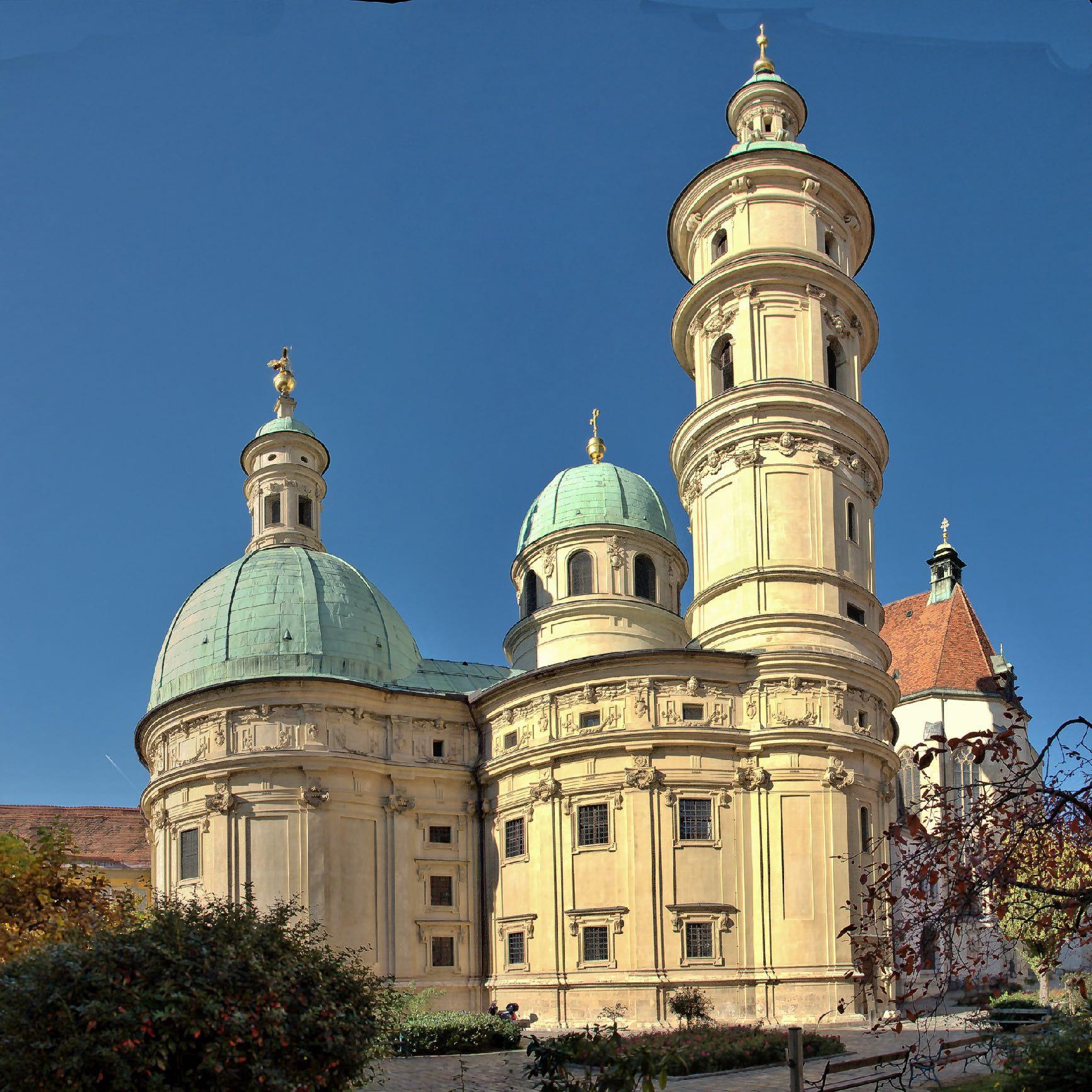 nach venezianischem Vorbild ohne Türme, diese wurden erst später unter Josef Hueber errichtet. Über den Hof gelangt man zu den Minoritensälen. Der große Minoritensaal ist einer der schönsten Barockräume der Landeshauptstadt. Insgesamt sind in dem Komplex drei Säle untergebracht, die den idealen Rahmen für Kongresse, Tagungen und kulturelle