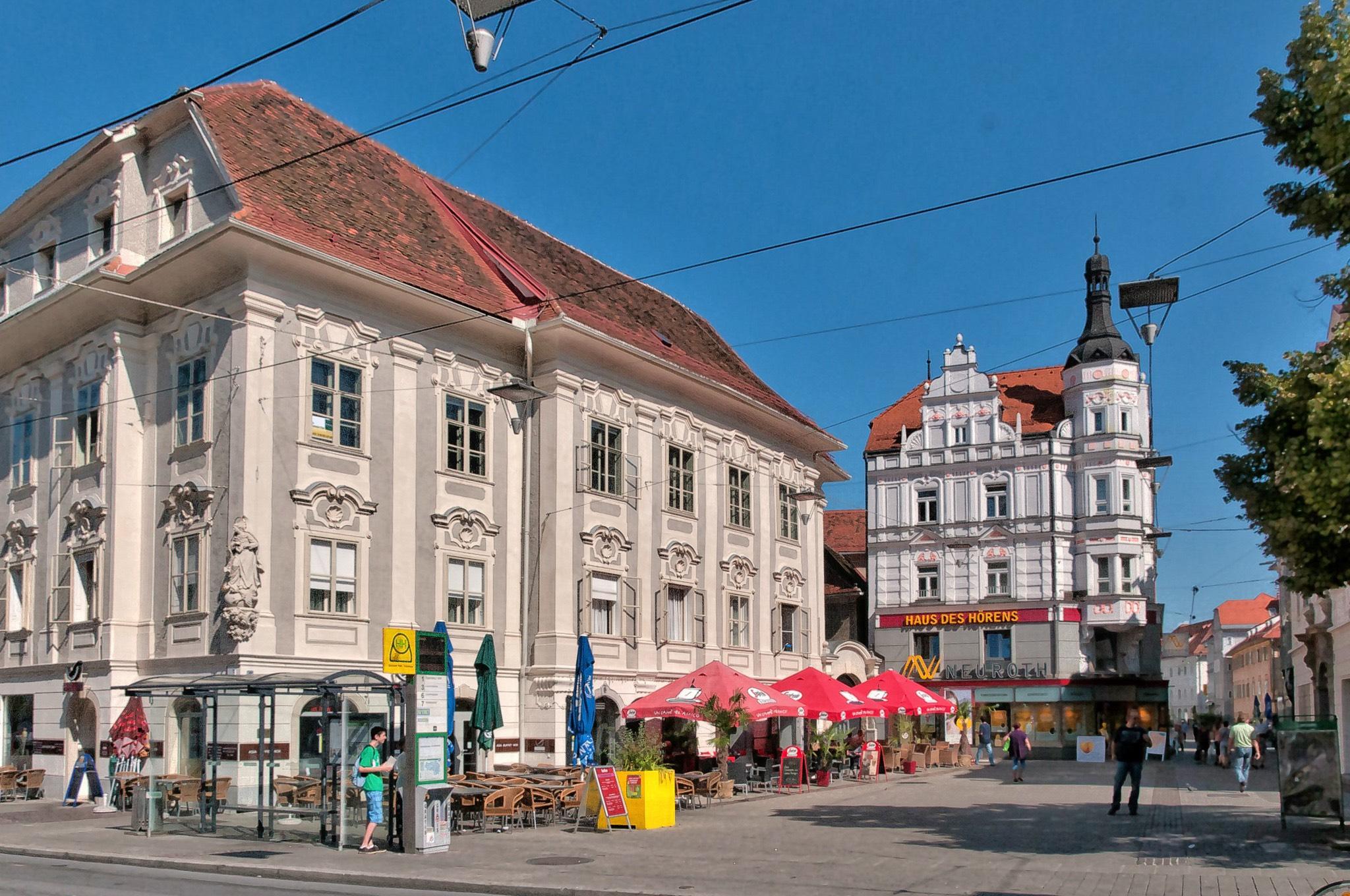Tor mit dem Hauptplatz. Die barocke Prachtstrasse wird von allen Grazer Straßenbahnlinien befahren, ansonsten ist der Bereich Fußgängerzone. Hier findet man das Landhaus, das gemalte Haus, viele Geschäfte, Cafés und Restaurants.