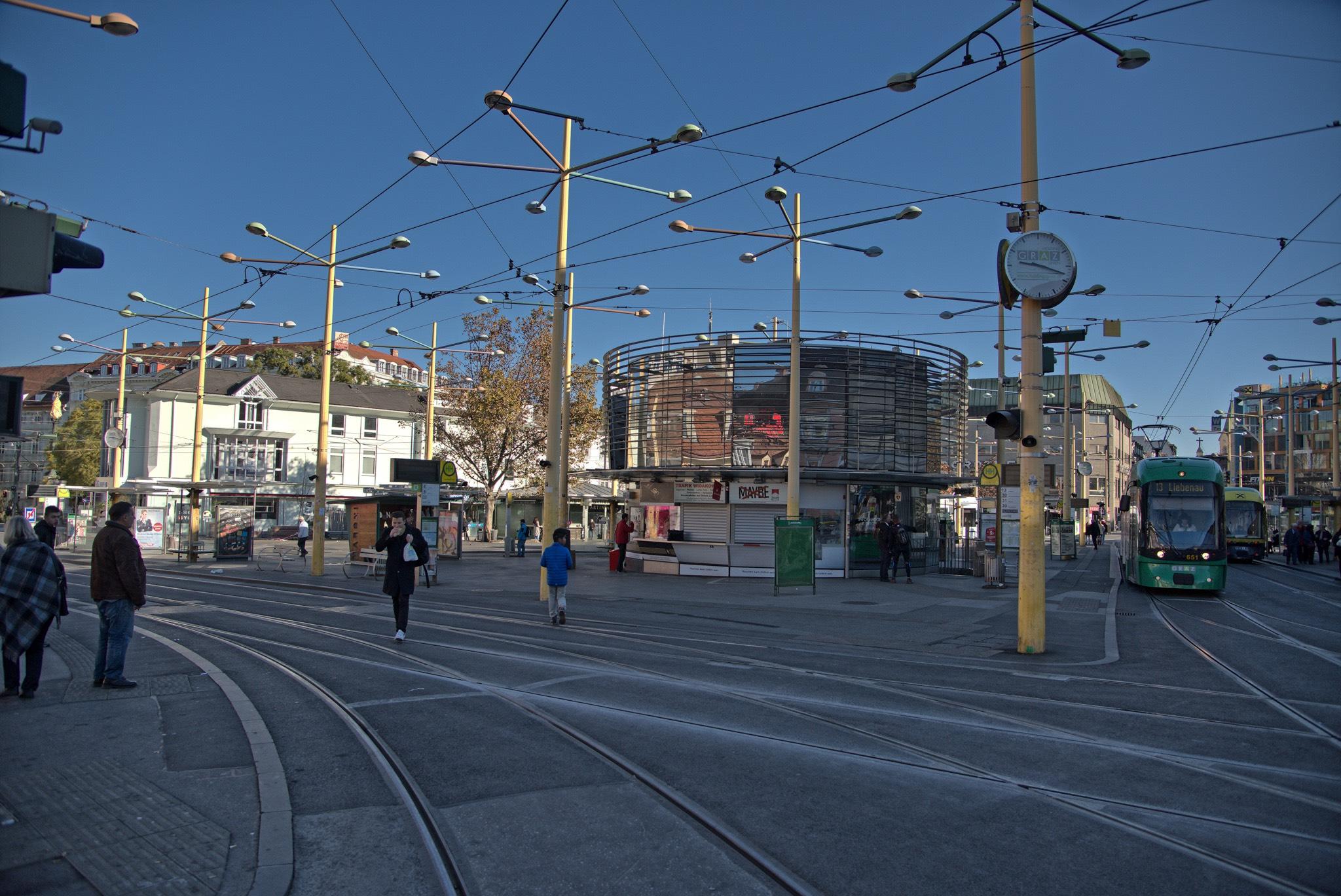 Der Jakominiplatz ist der zentrale Verkehrsknotenpunkt der Stadt Graz. Straßenbahn- und Buslinien treffen sich hier. Wenn man mit den öffentlichen Verkehrsmitteln in das Zentrum von