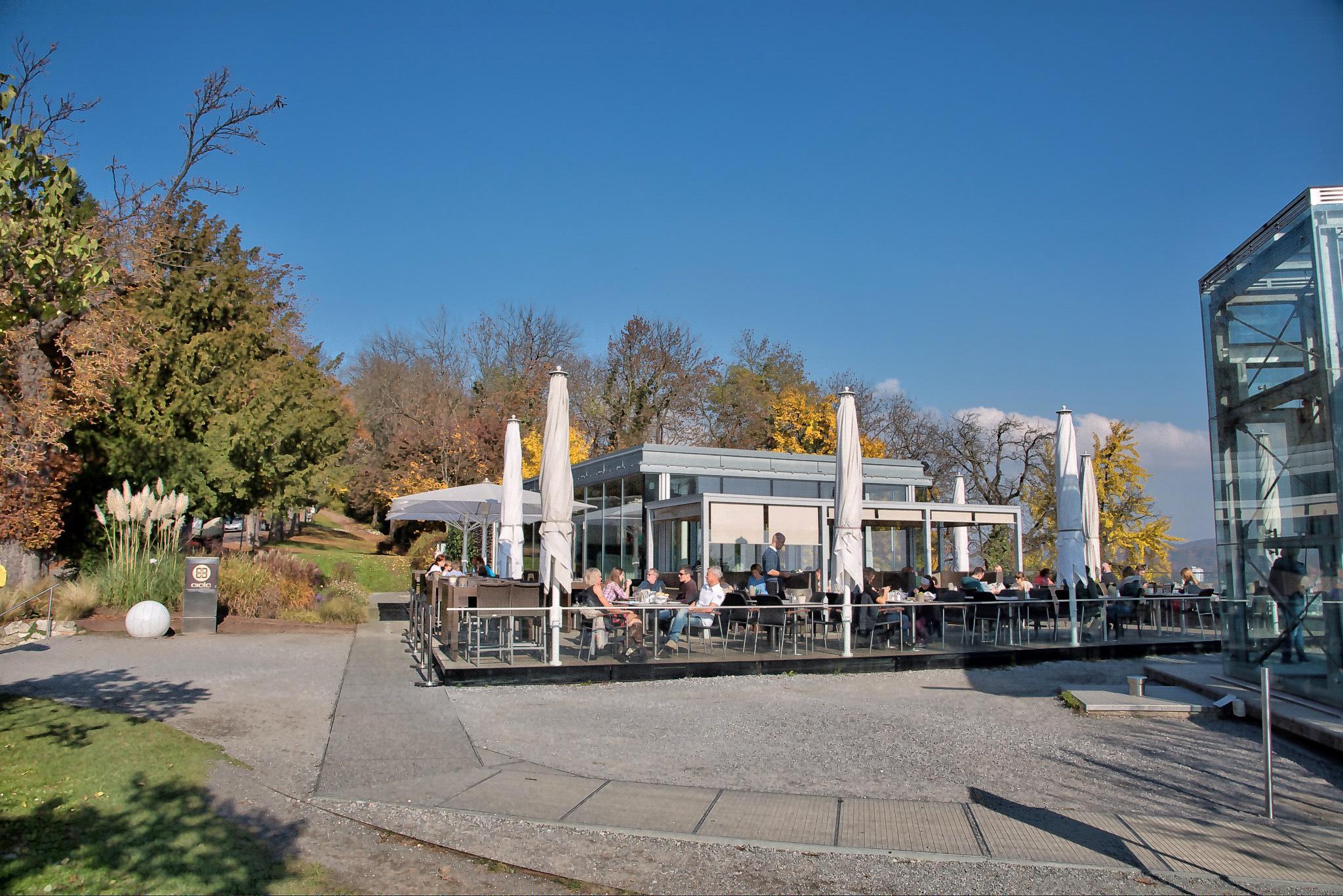 di Graz. Sulla terrazza c'è posto per 120 persone, all'interno per 60. Le pareti di vetro spariscono completamente nel terreno e l'interno e l'esterno del locale sono collegati tra di loro.