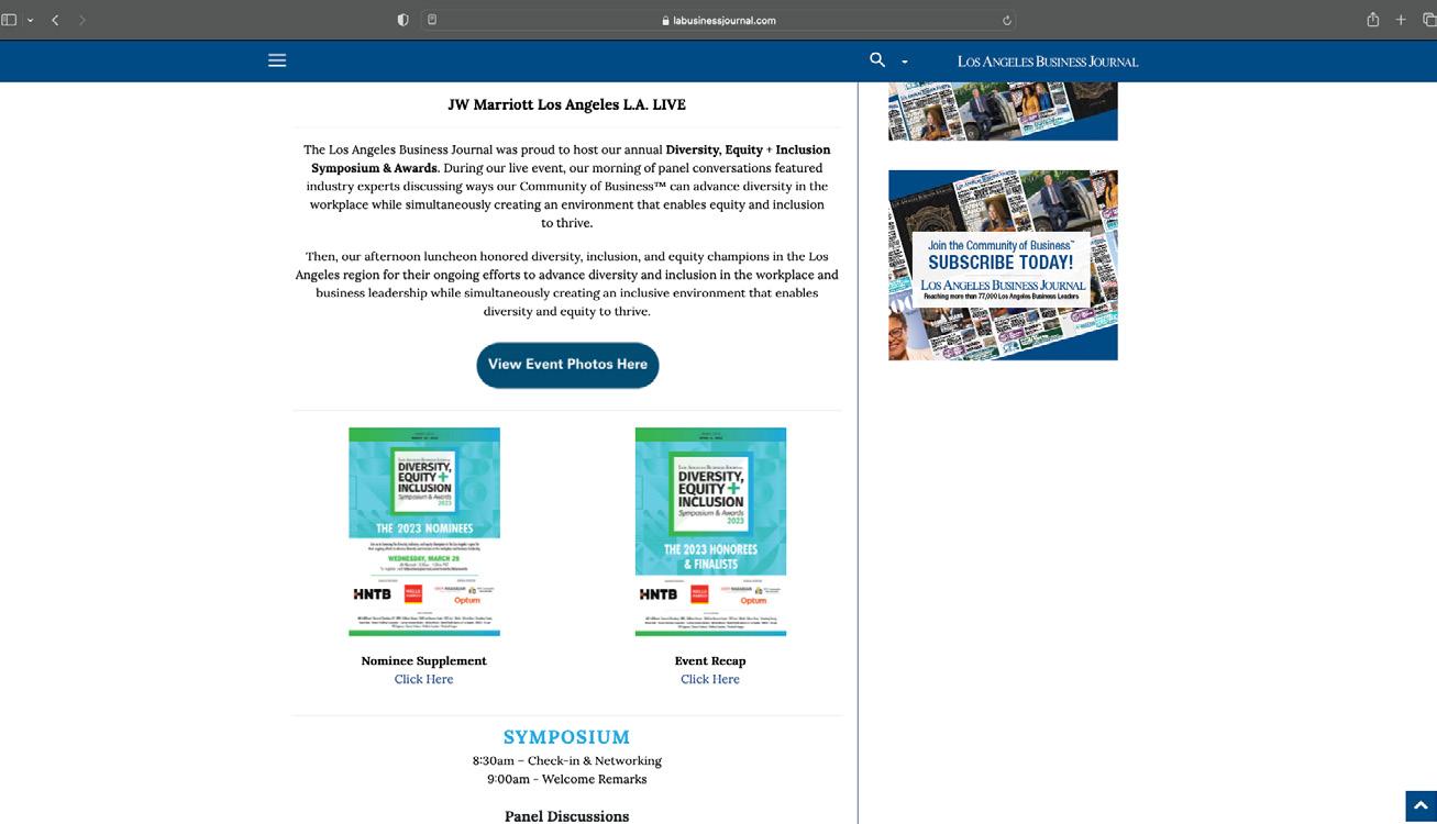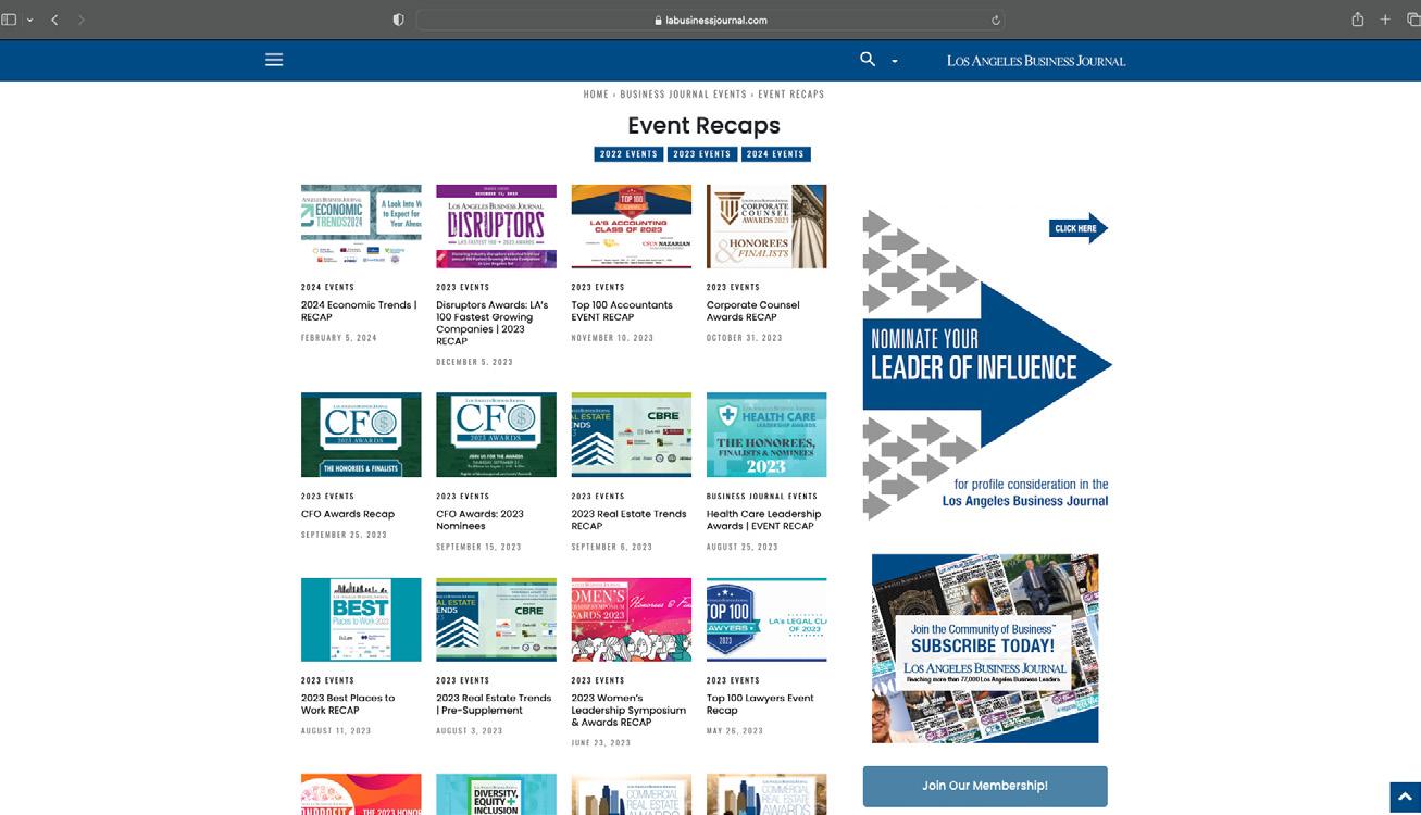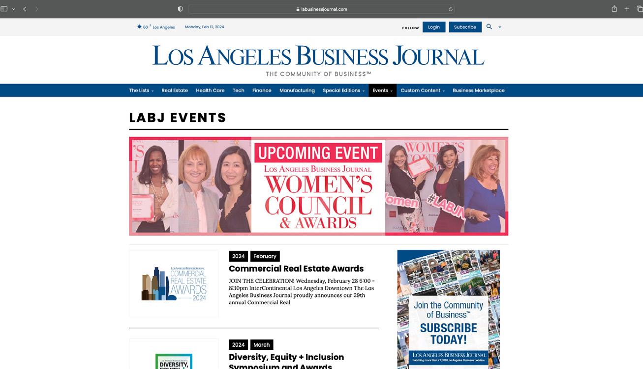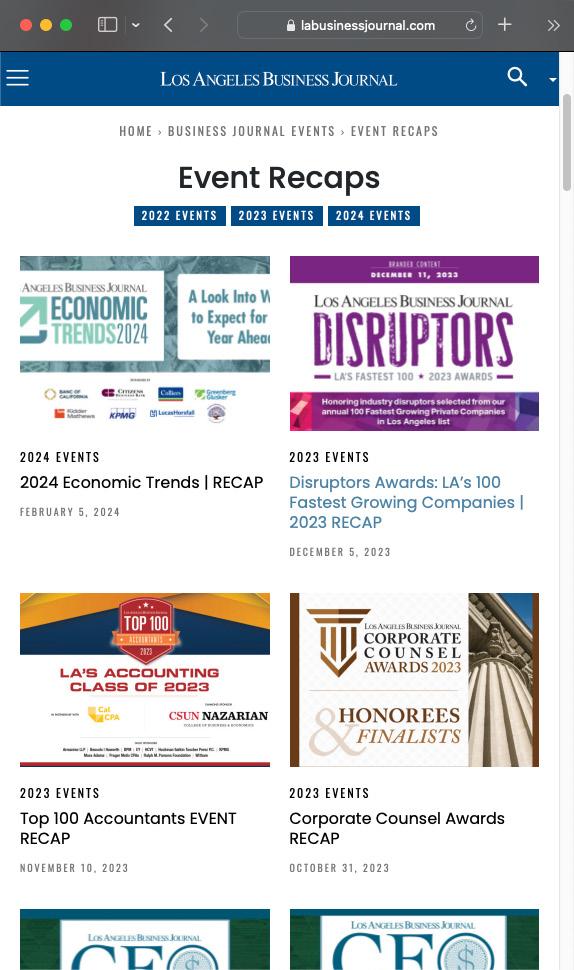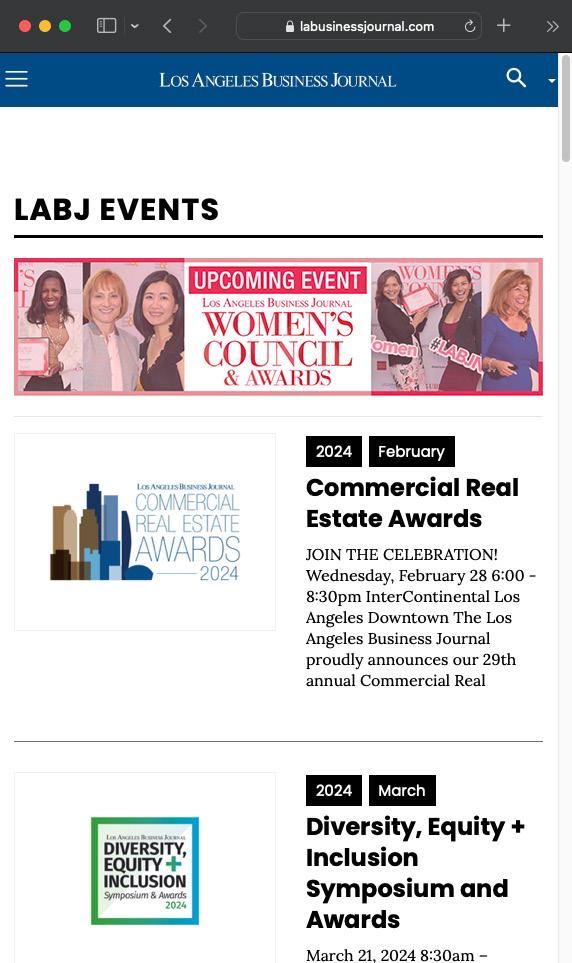 The Los Angeles Business Journal (LABJ) enlisted me to strengthen their brand identity and event presentation through a modern, business-focused online platform. I designed a clean, visually engaging website that reflected their values and showcased both flagship and subdivision events with clarity. The project required coordination across multiple departments as I refined key features such as subscription options and weekly video segments, elevating the site’s functionality and aesthetic. I’m proud to have delivered a solution that exceeded expectations and enhanced LABJ’s digital presence.