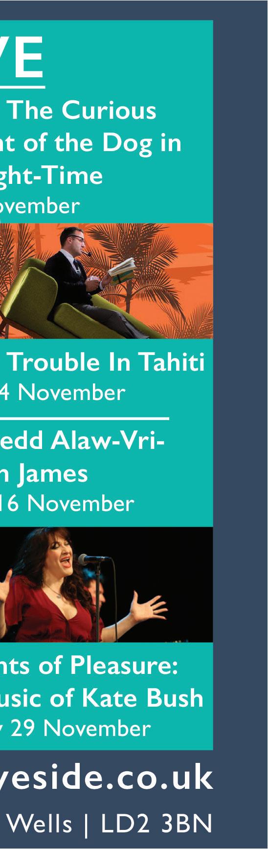 Sat 15 November & Sat 6 December KUNDALINI YOGA (Brilley). Movement, relaxation meditation, singing and anything else that works! £25-£30, bring a blanket, snacks and yogi tea. 07807 550653, georgie@healingspirits. co.uk www.healingspirits.co.uk