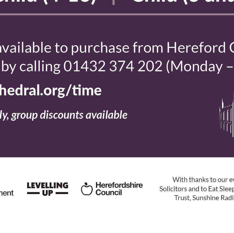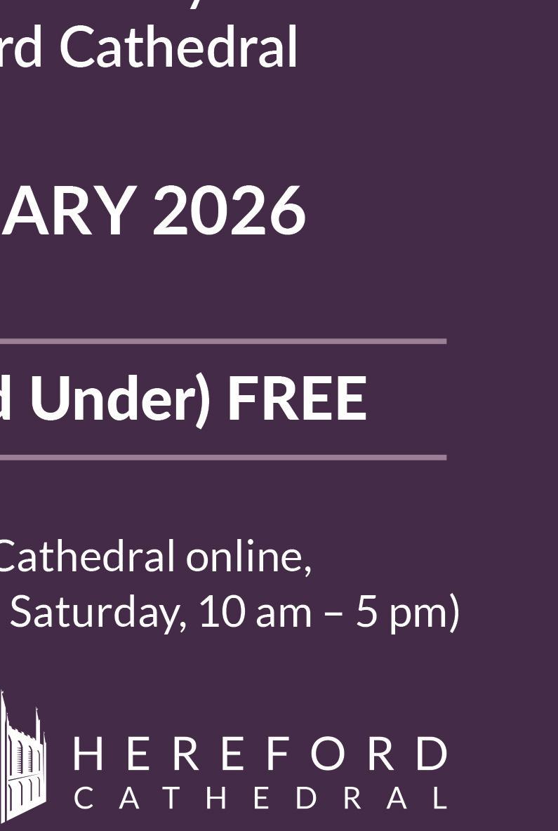 Mon - Sat - Cathedral Tours, 11.05 and 2.15pm, £7.50, students £6, 8-16 year olds £2. Selected dates - Tower Tours, £10, under 16s £5, students £8, 01432 374210. www.herefordcathedral.org