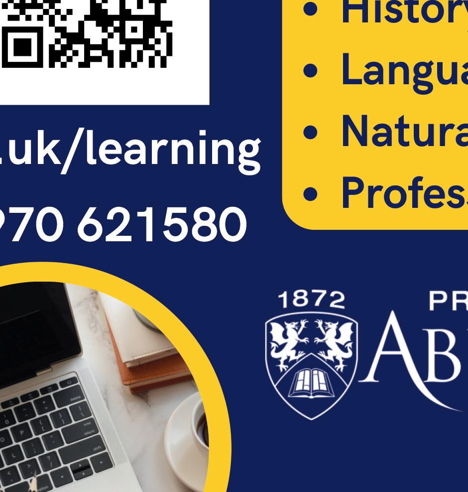 11 Feb - Autobiographical Writing, £130. 22 Feb - An Introduction ot History Sources at the National Library of Wales, £130. 27 Feb - Introduction to English Literature, £130. 3 March - Normalising Menopause, £70. Aberystwyth University Online Courses. Details 01970 621580, www.aber.ac.uk/learning