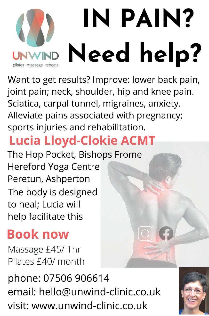 JING - LUCIA LLOYD-CLOKIE ACMT Looking to reduce your pain? Increase range of movement? You’ve found Unwind-clinic to help you! Advanced Clinical Massage Therapy; a unique outcome based system for addressing musculoskeletal pain through a fusion of advanced soft tissue techniques, myofascial release, trigger point therapy, and hot stones. Don’t delay, book in today and discover how amazing the body really is. Lucia looks forward to facilitating your healing journey, mobile: 07506 906614; email: hello@unwind-clinic.co.uk; website: www.unwind-clinic.co.uk; on IG and FB. Monday: Hereford Yoga Centre; Tuesday & Wednesday: Peretun, Ashperton; Thursday: Hop Pocket Village, Bishops Frome; Friday: Lotions and Potions, Church St, Hfd. Positive changes, one session at a time.