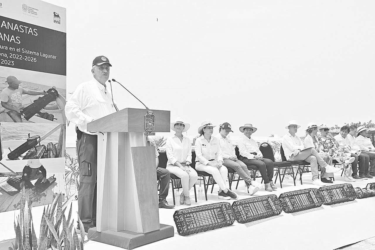Desde la Villa y Puerto de Sánchez Magallanes, acompañado del director general de ENI México, Giorgio Guidi, el mandatario distribuyó los apoyos entre representantes de cooperativas que se han sumado a los nuevos modelos de producción del molusco.