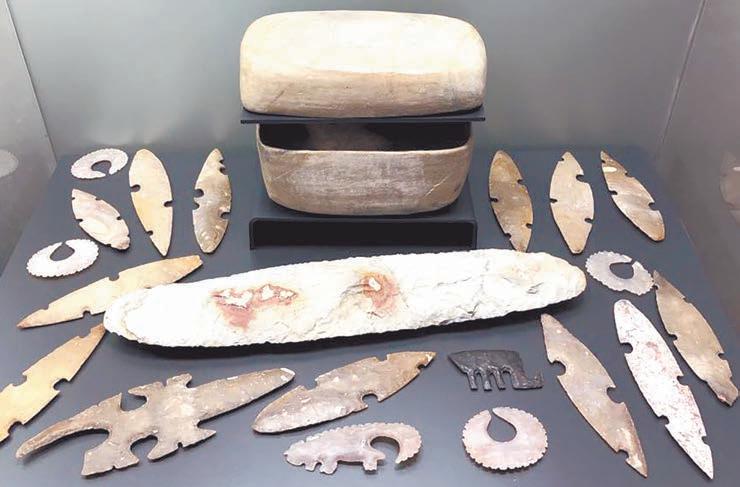 Esta ofrenda, integrada por una caja de cerámica con tapa, fue localizada en la zona arqueológica de El Tigre-Itzamkanac, Campeche. En ella se hallaba un hermoso excéntrico, y al frente un gran cuchillo de pedernal. Consta de 18 excéntricos, todos ellos de pedernal y cubiertos de ocre rojo (óxido, hidróxido de hierro). Cuatro de los excéntricos son semicirculares, mientras que dos son zoomorfos (un escorpión y un camaleón). los restantes de hoja de laurel con diferentes muescas. La caja de cerámica está pintada en su interior con rojo ocre. Las banderas sagradas, los santos y objetos sacros de algunos pueblos mayas de la actualidad se guardan en cajas de madera, muy similares a esta.