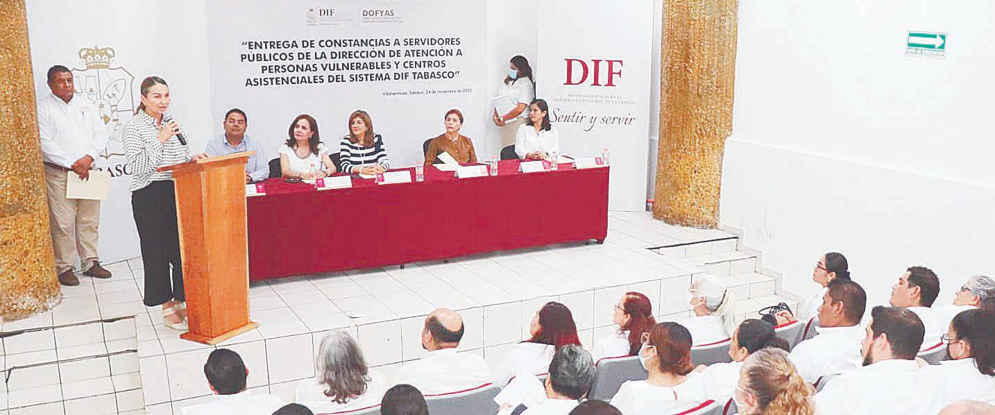 La presidenta del Sistema DIF Tabasco, Guadalupe Castro de Merino, entregó constancias de capacitación a trabajadores de la Dirección de Atención a Personas Vulnerables y Centros Asistenciales del organismo.