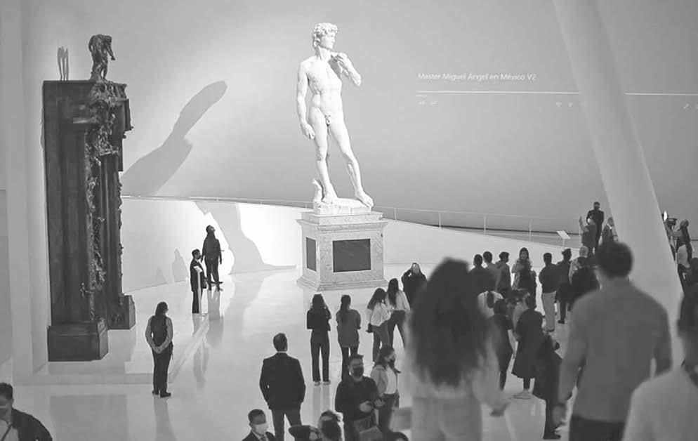 Una réplica certificada de la célebre escultura David, de Miguel Ángel Buonarroti (1475-1564), que es la representación del rey David a punto de enfrentarse con Goliat, con la piedra en una mano que aprieta y expresa por sí sola, mentón arriba, mirada sobre el hombro y ceño fruncido, con todos sus músculos en tensión, recibe a los visitantes del Museo Soumaya. En el vestíbulo del recinto también se encuentra una copia exacta de La Piedad; ambas esculturas fueron realizadas con las autorizaciones que los Museos Vaticano y el gobierno italiano otorgaron a la casa fundidora artística Ferdinando Marinelli.