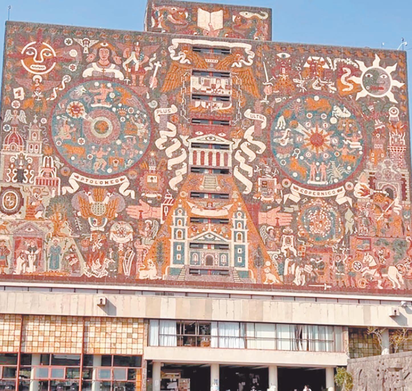 Contemplar el exterior de la Biblioteca Central de la Ciudad Universitaria de la UNAM es abarcar con un golpe de vista la historia de México, desde la fundación de Tenochtitlan y la Conquista hasta la aparición de la energía atómica y la universidad contemporánea. Con miles de rocas de color adheridas al edificio, Juan O’Gorman invita al espectador a viajar por el tiempo con un mural que se despliega poco a poco, tal y cómo hacen los códices prehispánicos.