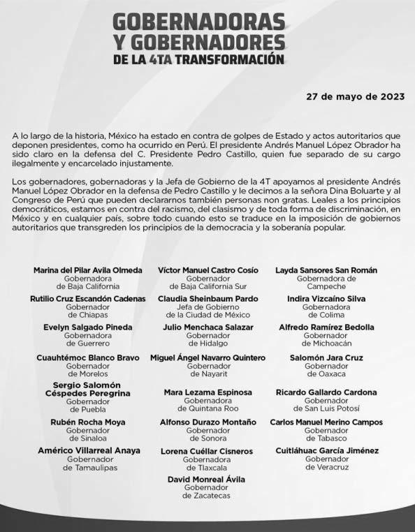 “Losgobernadores,gobernadoresylajefadegobiernodela CuartaTransformaciónapoyamos alpresidenteAndrésManuel LópezObradorendefensade PedroCastilloledecimosalaseñoraDinaBoluarteyalCongresode Perúquepuedendeclararnostambiénpersonasnogratas”.