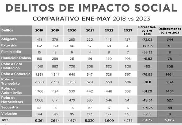 Alquintomesdeeste 2023setuvieron5mil087 delitosmenos,enrelación alañoenqueserecibióla administraciónpública, resultadodeltrabajocoordinadodelostresórdenes degobiernoybajolaestrategianacionaldeseguridad.