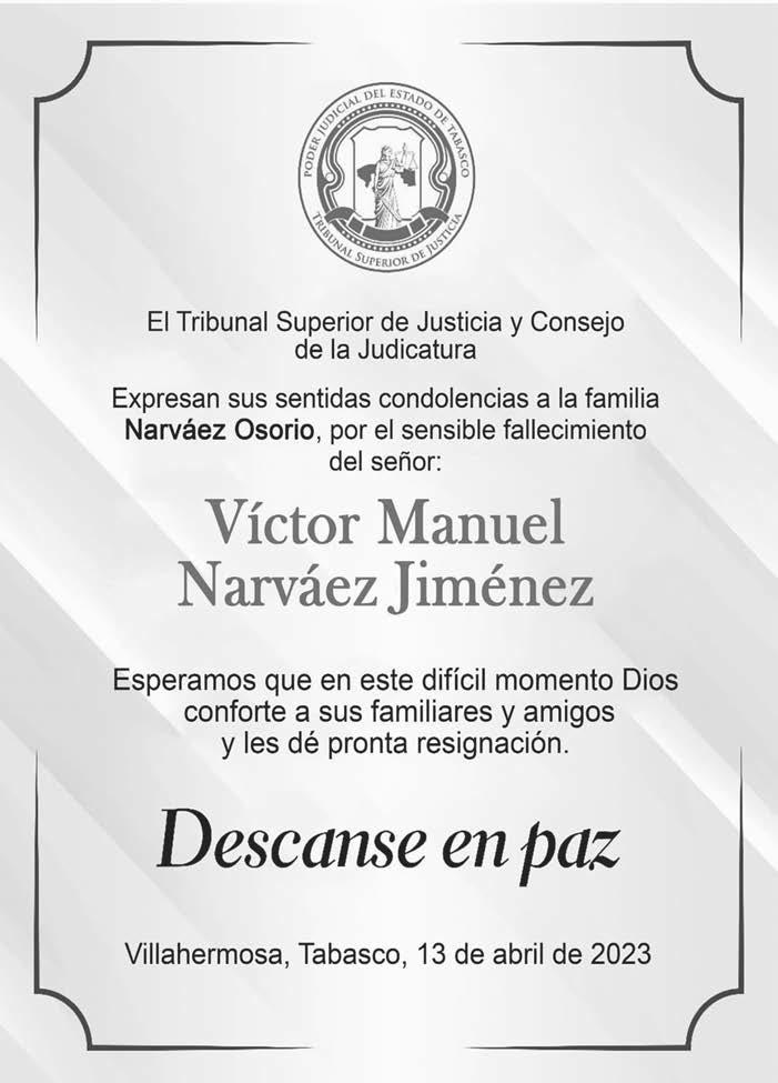 Nuestro Rector de la Máxima Casa de Estudios de Tabasco como es la UJAT, Guillermo Narváez Osorio, reciba nuestras condolencias ante la irreparable pérdida de su señor padre el que fuera estimado personaje Don Víctor Manuel Narváez en el municipio Tacotalpa, Tabasco, deseándole a la vez pronta resignación por tan lamentable pérdida.
