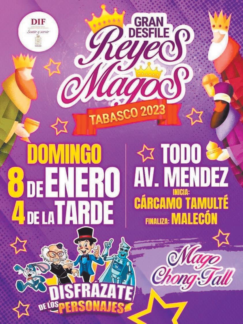 Adelantamos nuestras felicitaciones a todos los niños que este viernes festejaran en grande el “Día de los Reyes Magos”, por lo que esperamos se hayan portado bien y reciban lo que han pedido en sus cartitas. Seguramente Melchor, Gaspar y Baltazar se aprestan a llegar con innumerables juguetes y sorpresas para así cumplir los deseos de los reyes de los hogares. Quien ya casi se encuentra listo, es el estimado maestro Raúl Torres Fócil, mejor conocido como el mago Chong-Tall, que este domingo 8, bajo los auspicios del DIF Tabasco que encabeza la señora Guadalupe Castro de Merino; realizara, después de casi tres años de pandemia, el “Gran Desfile de Reyes Magos”, que chicos y grandes podrán admirar en su paso por la avenida Gregorio Méndez Magaña. Con este importante evento al que se han sumado numerosas empresas y voluntarios, el mago ChongTall, celebrará 50 años de actividad artística. ¡¡¡Enhorabuena!!!