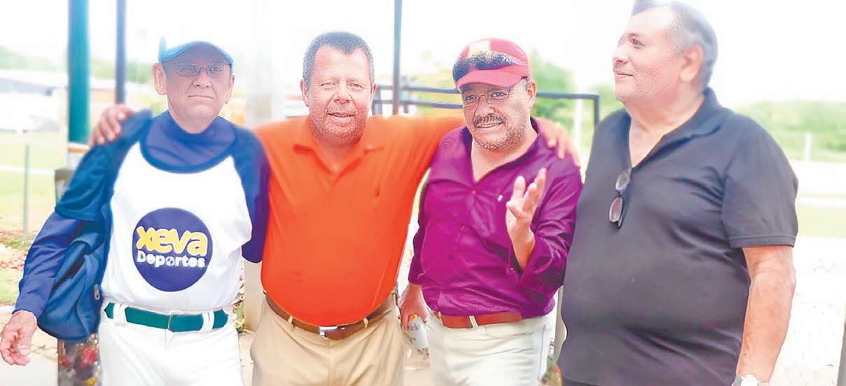 Roger Zentella, Abimael Gallegos “Panucho” con los cronistas deportivos Víctor “El Pony” Arias y Sergio Garrido, luego de presenciar un juego de ese nuevo deporte como lo es el Béis-Soft,