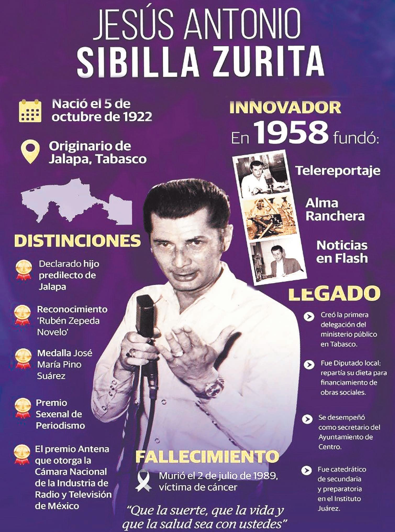 “Sibilla Zurita, Jesús Antonio. (Chucho Sibilla) Licenciado en Derecho por la UNAM. Nació en Jalapa, Tab., “el 15” de octubre de 1922. Fue diputado local por el distrito VIII, en la XL y en la XLV Legislaturas. Incursionó por primera vez en la radio a fines de la década de los 50, del siglo XX, en la radiodifusora XEWM; sus aspiraciones políticas lo hicieron retirarse algunos meses de la radiodifusión, cuando regresó lo hizo en la estación XEWM (hoy XETAB) y el 22 de septiembre de 1958 nace su programa Telereportaje, tiempo después produjo los programas Alma Ranchera y Noticias en Flash. En 1949 formaba parte de la planilla de maestros del Instituto Juárez, en donde impartió las cátedras de Educación Cívica y Economía Política. En 1959, como maestro del bachillerato de Ciencias Sociales, dependiente de la Universidad Juárez de Tabasco, impartió la materia de Historia Universal. En vida recibió varias distinciones dentro de las que destacan: haber sido declarado Hijo predilecto de su pueblo natal; También la Asociación Nacional de Locutores le otorgó el Reconocimiento Rubén Zepeda Novelo por su aporte a la radiodifusión nacional y en 1980, recibió el Juchimán de Plata. Falleció el 2 de julio de 1989. El Congreso de Tabasco le otorgó pos morten la Medalla José María Pino Suárez, por el servicio y lealtad a su estado.