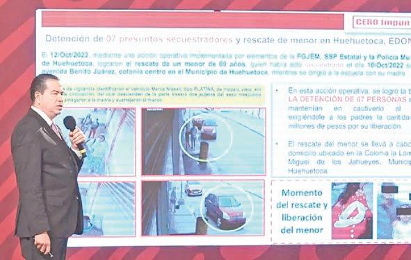La Secretaría de Seguridad y Protección Ciudadana (SSPC) informó que los delincuentes que secuestraron a un menor en Huehuetoca, en Estado de México el 10 de octubre, pedían de rescate cuatro millones de pesos por liberar al menor. En la conferencia mañanera, el subsecretario de Seguridad, Ricardo Mejía, detalló que, luego de que se hizo viral el momento del secuestro, se desplegó un operativo logrando liberar a la víctima dos días después y detener a siete presuntos delincuentes.