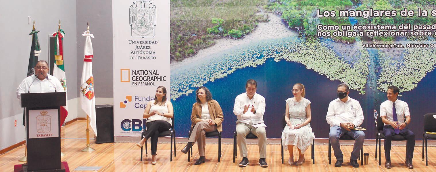 Mara Álvarez Rumbo Nuevo National Geographic en español y la Universidad Juárez Autónoma de Tabasco realizaron la presentación del reportaje “Los manglares de la Selva”, el cual se publica en la edición de octubre de la misma revista. Como parte de esta presentación, el rector, Guillermo Narváez Osorio; la presidenta del Voluntariado UJAT, Aura Estela Noverola de Narváez; la presidenta del Sistema DIF Tabasco, Guadalupe Castro de Merino y en representación del gobernador del estado, la Coordinadora General de Asuntos Jurídicos, Karla Cantoral Domínguez, realizaron el corte del listón de la exposición fotográfica “Los Mangles de la Selva” fotografías tomadas por el doctor Octavio Aburto Oropeza, las cuales son parte del proyecto de investigación.