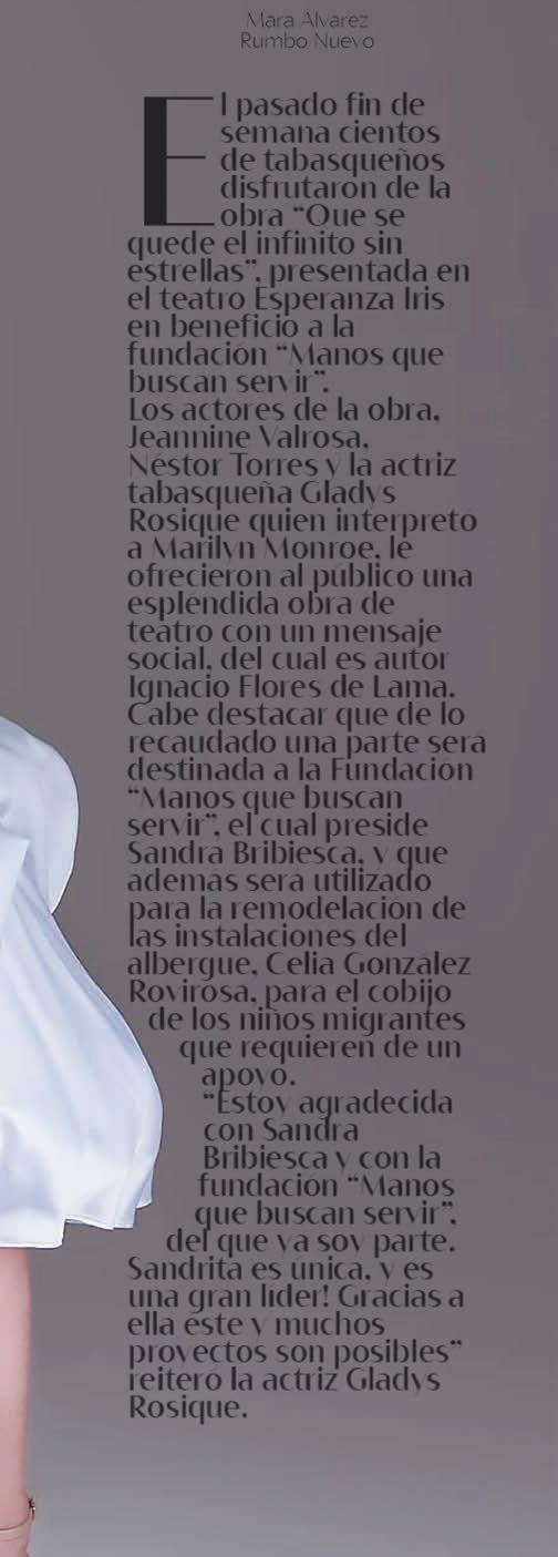 Elpasado fin de semana cientos de disfrutarontabasqueños de la obra “Que se quede el infinito sin estrellas”, presentada en el teatro Esperanza Irisen beneficio a la fundación “Manos que buscan servir”. Los actores de la obra, Jeannine Valrosa, Néstor Torres y la actriz tabasqueña Gladys Rosique quien interpretó a Marilyn Monroe, le ofrecieron al público una espléndida obra de teatro con un mensaje social, del cual es autor Ignacio Flores de Lama. Cabe destacar que de lo recaudado una parte será destinada a la Fundación “Manos que buscan servir”, el cual preside Sandra Bribiesca, y que además será utilizado para la remodelación de las instalaciones del albergue, Celia González Rovirosa, para el cobijo de los niños migrantes que requieren de un apoyo.