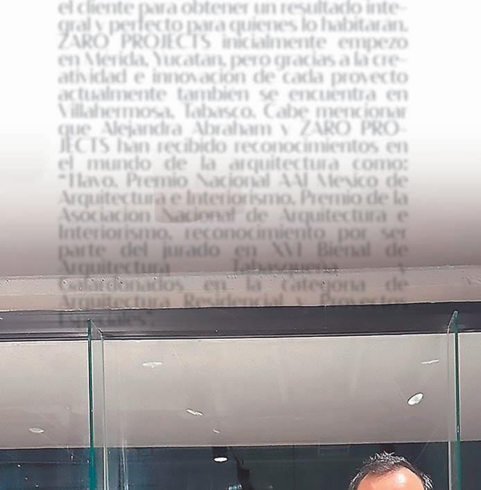 Una mujer apasionada, detallista y proactiva. Así definimos a la Arquitecta Alejandra Abraham López, nacida en Mérida, Yucatán, con tan solo 28 años de edad ha logrado importantes reconocimientos y logros en su vida profesional. Egresada de la Universidad Anáhuac desde hace 3 años tomó la decisión de emprender abriendo las puertas a su propia firma de arquitectura e interiorismo en conjunto con el arquitecto Saúl Retureta, la cual hoy en día lleva por nombre ZARQ PROJECTS. Esta firma se caracteriza por vivir con pasión y dedicación cada etapa de un proyecto, estableciendo una relación íntima y directa con el cliente para obtener un resultado integral y perfecto para quienes lo habitarán. ZARQ PROJECTS inicialmente empezó en Mérida, Yucatán, pero gracias a la creatividad e innovación de cada proyecto actualmente también se encuentra en Villahermosa, Tabasco. Cabe mencionar que Alejandra Abraham y ZARQ PRO- JECTS han recibido reconocimientos en el mundo de la arquitectura como: “11avo. Premio Nacional AAI México de Arquitectura e Interiorismo, Premio de la Asociación Nacional de Arquitectura e Interiorismo, reconocimiento por ser parte del jurado en XVI Bienal de Arquitectura Tabasqueña y Galardonados en la categoría de Arquitectura Residencial y Proyectos Especiales”.