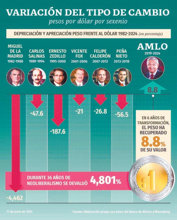 transformación, el peso recuperó 8.8% de su valor, y detuvo la devaluación que en 36 años de gobierno neoliberales, se devaluó en 4801% frente al dólar, y así continuará con nuestra presidenta electa, con la finalidad de tener una estabilidad económica en todos los sentidos. De igual forma, dentro de sus redes sociales, habló que este 12 de junio es el día mundial contra el trabajo infantil, y pidió que reforcemos el compromiso para poner un alto la explotación infantil, por un futuro lleno de educación, salud y bienestar, que el único que trabaje sea su imaginación.