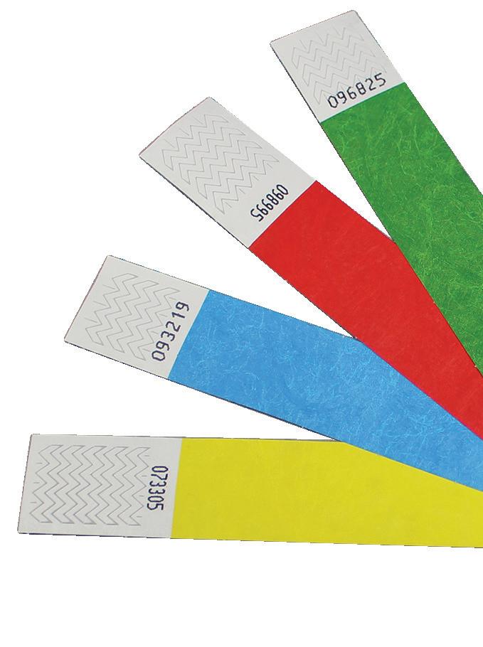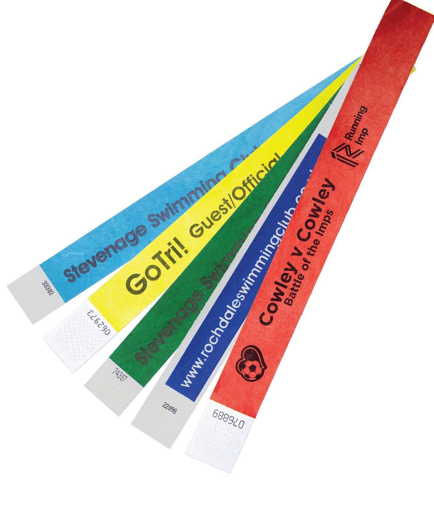Plain coloured wristbands. Tyvek security proof wristbands. Sold in 20s. Available in red, green, yellow and blue. Numerous uses. Only 15p each.