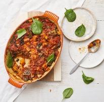 En mustig gratäng passar fint till fest. Rostad sötpotatis kombineras med svarta bönor, spenat och tomatsås.