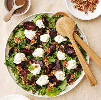 Den rostade salladen har smak av knapriga nötter, söta rödbetor och mjuk färskost. Salladen räcker till många.