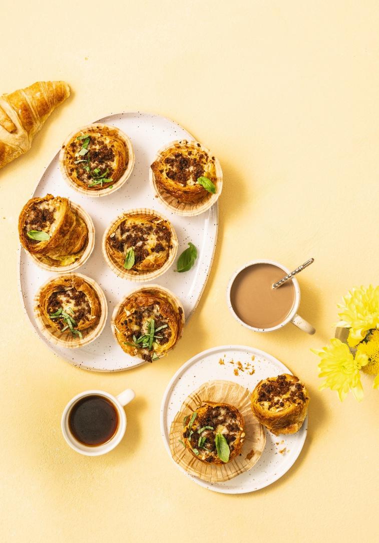 1. Skär croissanterna itu. Lägg muffinsformarna i en muffinsplåt och ställ croissanthalvorna upprätt i formarna. Öppna upp halvorna lite för hand.