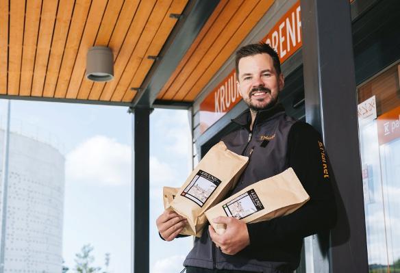 Joonas Purolinna tycker att butikens eget kaffe Kruunis smakar bäst på butikens terrass vid havet.