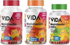 Nallebjörnarna VIDA Multivitamiininallet gillas av hela familjen. De mjuka tuggbara nallebjörnarna innehåller nio vitaminer och zink. Finns i smakerna söt Jordgubbe och smakmixen Smultron-Apelsin, samt nya Tutti Frutti. VIDA stöder Barnklinikernas faddrars arbete.