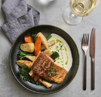 Av knaperstekt regnbågsforell och rostade rotsaker kan du enkelt komponera en festlig och riktigt läcker portion.