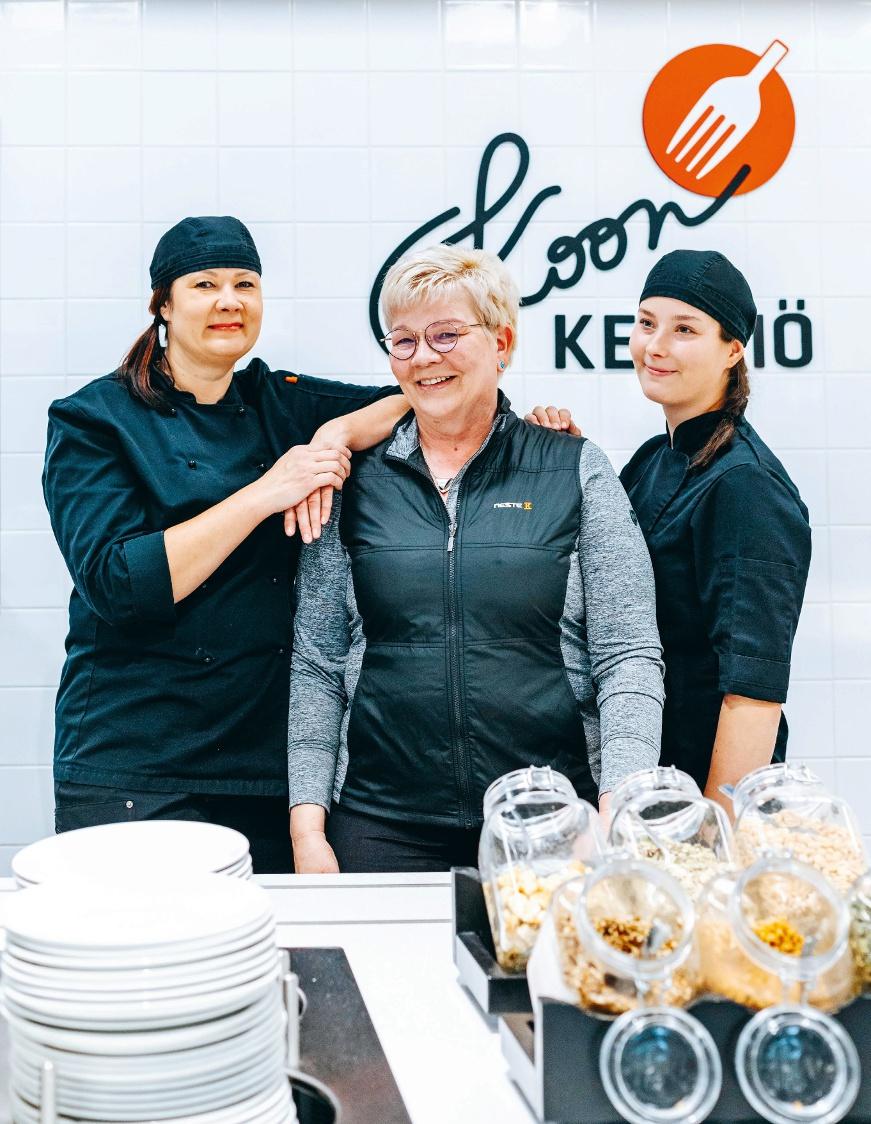 Anna-Liisa ’Ansku’ Arminen kertoo vetävänsä maailman parasta tiimiä. Kuvassa Neste K -ravintolan työntekijöistä Ida Paukku (vas.) ja Minna Kajoskivi (oik.).