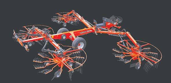 All the features that have made the KUHN four-rotor rakes popular have been retained, including the exclusive 100% hydraulic drive system, that allows perfect adaptation of rotor speed to the forage type and yield, while minimising maintenance work.