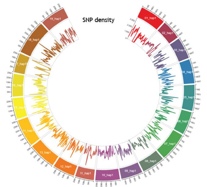 Figure 3: Variation between the two haplotypes (DNA inherited from different parents) in the Sauvignon Blanc genome. The above image shows the high degree of variability across each of the 19 chromosome pairs that make up the grapevine genome – including an estimated 5.65 million single nucleotide variants.
