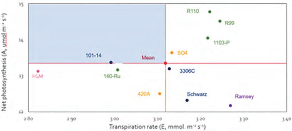 Water use optimisation was measured as the relationship between photosynthesis and transpiration (Figure 2). Ramsey, Schwarzmann, 420A and Riparia gloire consistently had a photosynthetic rate below the mean. Riparia gloire managed water losses efficiently with low transpiration rates, potentially leading to smaller above ground structures and smaller