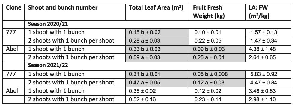 Table 1 Effect of shoot number on average and total leaf area (LA), fruit mass and LA:FW ratio in both PN clones (Abel & 777) for both seasons (2020/21 and 2021/22). ± indicates Standard Error of the Mean (SEM).