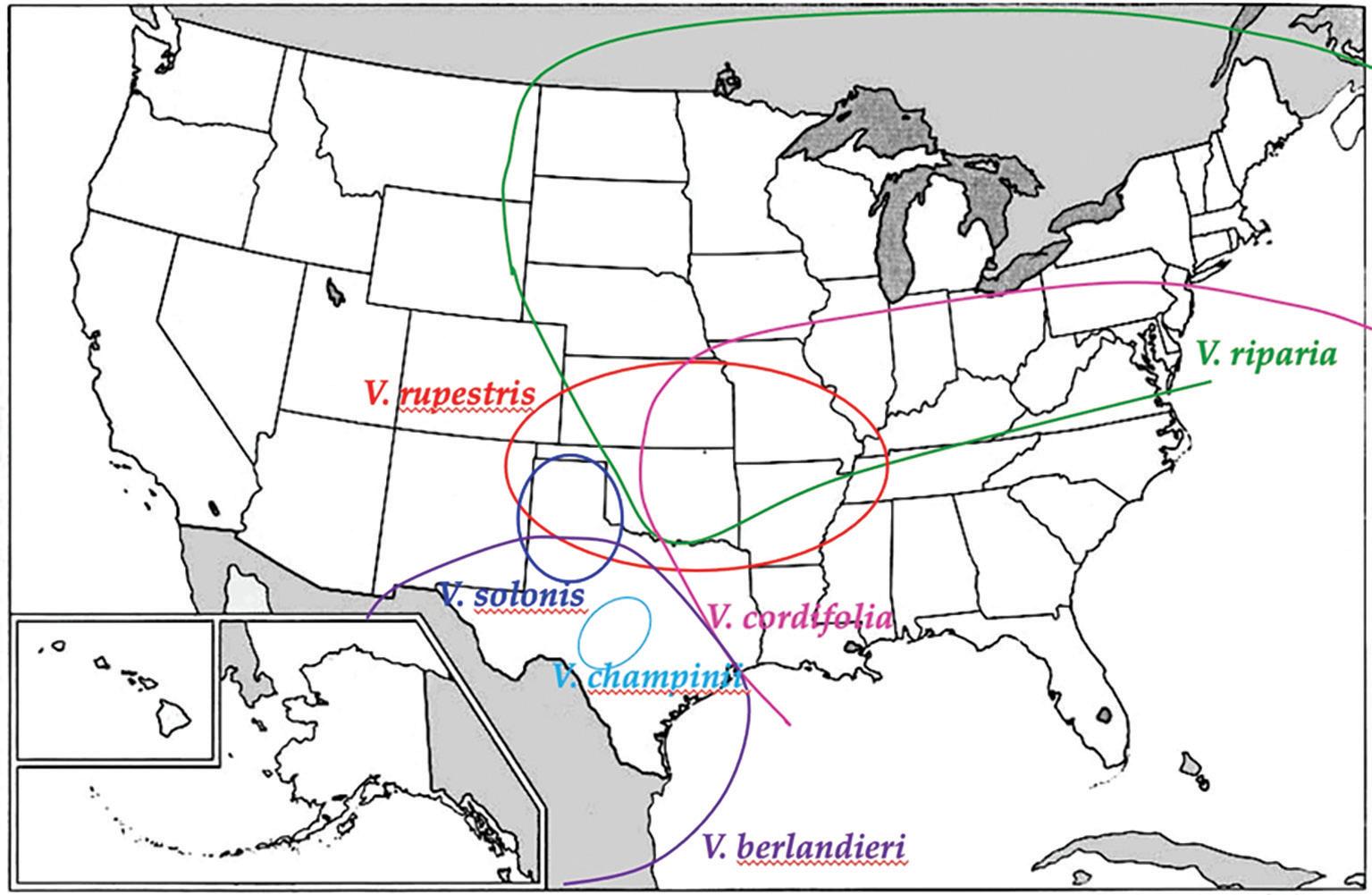 Figure 2. Parentage of internationally available rootstocks according to their breeders. Recent research confirmed the genetic background of most but not all of these hybrids (Riaz et al., 2019). One of the unknowns is the widely used 3309 Couderc. The rootstocks used in the BRI trial are highlighted in grey.